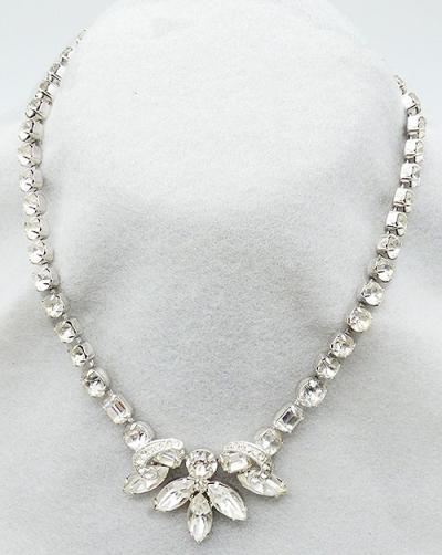 Description: Eisenberg vintage clear rhinestone silver plated necklace; the center has a fan of clear rhinestone navettes below larger round and baguette clear rhinestones with two curls set with small clear rhinestones overlapping at the sides. The rest of the necklace is slightly smaller clear round rhinestone chain with extender chain on one end and hook on the other. All stones prong set. Signed 'Eisenberg' in black letters on the back of the hook.