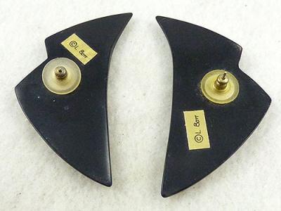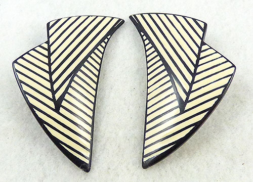 Description: Lawrence Bott black and cream striped resin pierced earrings; thin cream pinstripes on black resin overlapping triangles in Bott's classic graphic style. Signed '©L. Bott' on tags on the backs.