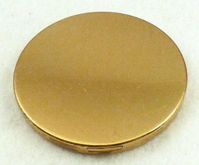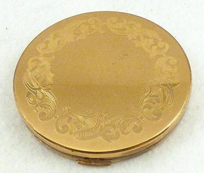 Description: Elgin American gold tone round compact; the top has an etched vine of leaves around the border. Inside, mirror is on top half, compartment for power on the bottom. Signed 'Elgin American Made in U.S.A' on the inside.