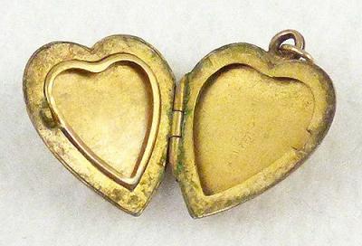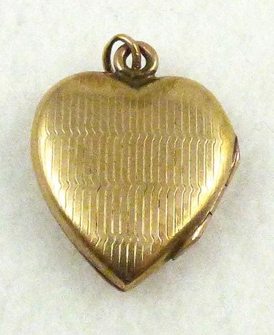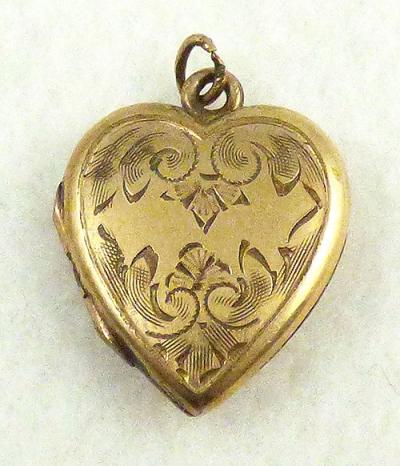 Description: Bliss Brothers 10kt gold filled heart locket; the front has a finely etched design of swirls and curls, the back has engine turned etching. Signed with small 'B' and 'Co' inside larger 'B', mark for Bliss Brothers and '1/20 10Kt, all on the inside of the back of the locket.