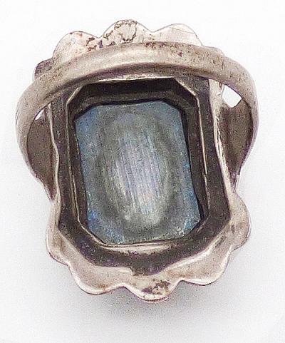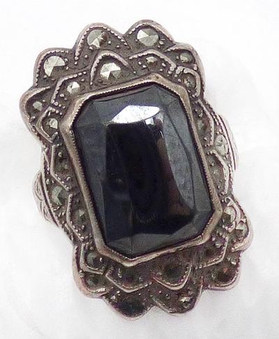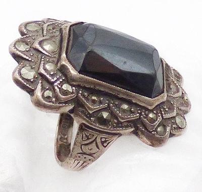 Description: Uncas sterling silver marcasite and hematite stone ladies ring, very small and beautiful as a pinky ring. The faceted rectangular hematite stone is in a double layered frame with scalloped edge and set with marcasites. Etched design on the sides and signed 'U' with arrows, mark for Uncas since 1919, and 'Sterling'.