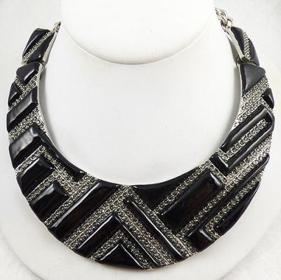 Description: Oscar de La Renta rigid torc style collar necklace, a striking geometric design with different size black resin rectangles and right angle pieces set across the wide curve of the rigid, flat silver plated centerpiece. The black pieces are separated by rows of clear crystal rhinestones. The large curved centerpiece is attached to two small links towards the back and then thick silver tone chain with smaller silver tone extender chain on one side. Lobster clasp with an 'Oscar de La Renta' hang tag and signed 'Oscar de La Renta' and 'Made in USA' on the back. .