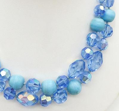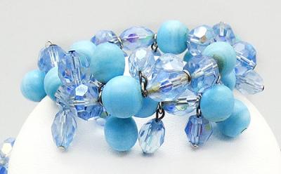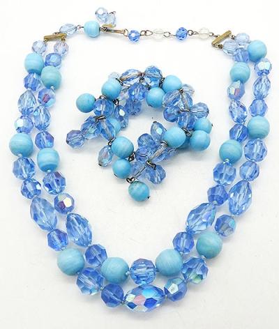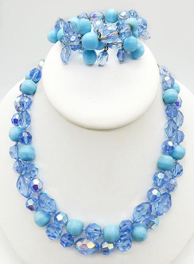 Description: Hobé vintage light blue crystal and opaque aqua bead double strand necklace and memory wire wrap bracelet; the necklace strands have oblong and round light blue faceted crystal beads mixed with opaque matte aqua glass beads, the two strands attach to silver tone connectors with extender chain on both sides. The matching bracelet is a single strand of the same blue crystal and aqua beads on memory wire with the addition of matching bead dangles. Signed 'Hobé©' on the necklace hook clasp.