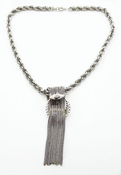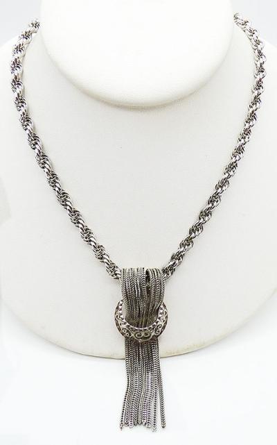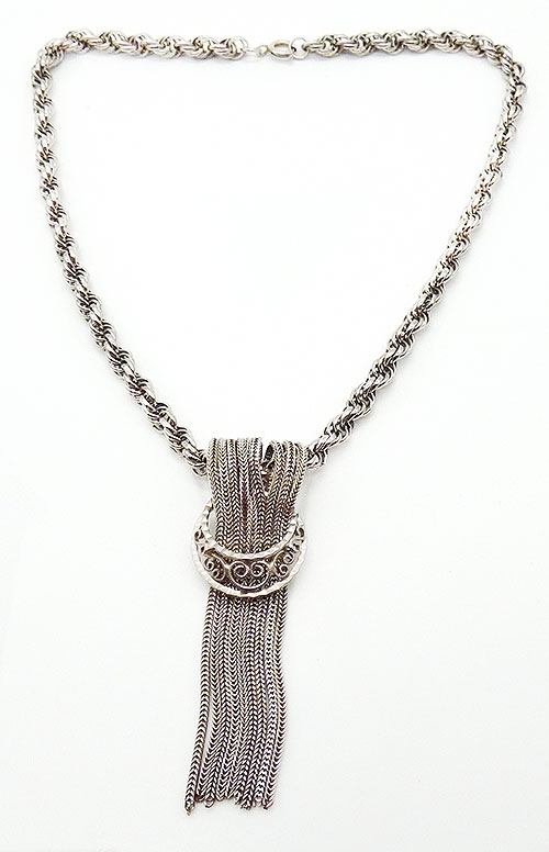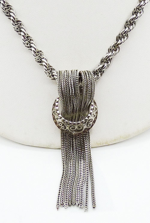 Description: Hobé vintage silver tone filigree and ling chains tassel necklace; nine lengths of thin herringbone chain threaded through a silver tone filigree ring and attached to a thick silver tone rope chain necklace. Signed 'Hobé' on the back.