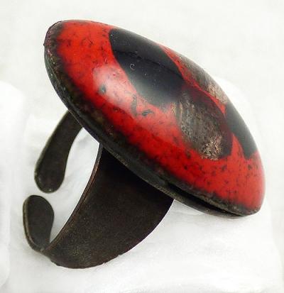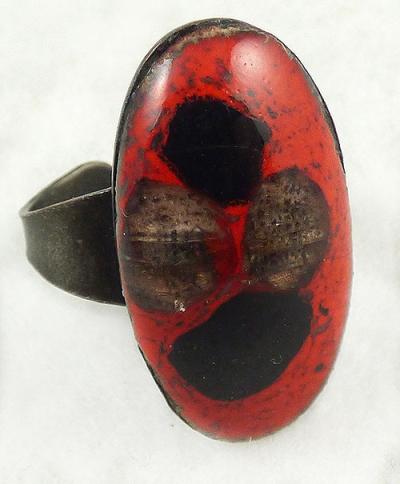 Description: Vintage silver tone base metal fused glass ring, the large oval is decorated with black and brown spots on a bright red background. Plain tapered adjustable band. Looks to be hand made.
