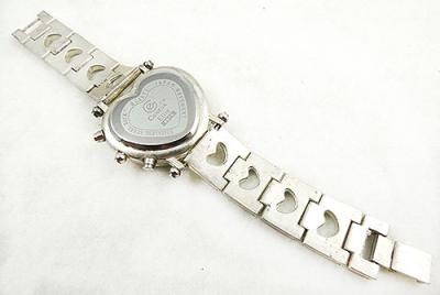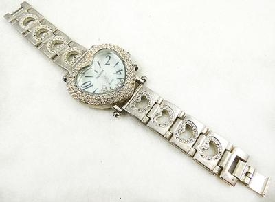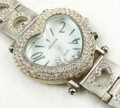 Description: Women's Geneva Elite rhinestone heart bracelet watch; the large heart shaped watch has a white mother-of-pearl face framed by three rows of clear rhinestones and with large black numbers, silver tone hands and floating clear rhinestones. The silver tone band has a heart shaped cut-out in each link which is edged with clear rhinestones, fold-over clasp. The back is marked 'Geneva Elite #976' with the Geneva logo, 'Stainless Steel Back' and 'Japan Movement'. The face is 'Geneva', 'Elite' and 'Japan Movt'.