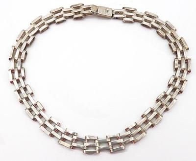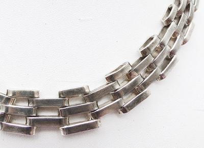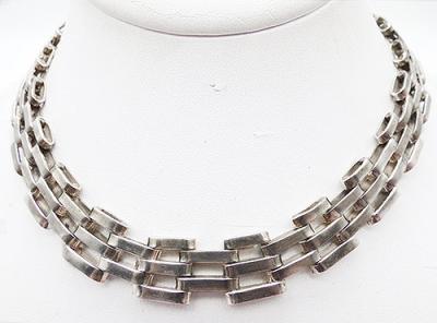 Description: Vintage Mexican sterling silver gate link necklace, the interlocking oval links are flexible and slinky with great mid-century mod design. Signed 'Mexico 925' on the back of the locking push-in clasp, and there was a maker-s mark that has worn away and is illegible. Appears to have been a post-eagle mark, dating this to after 1979..