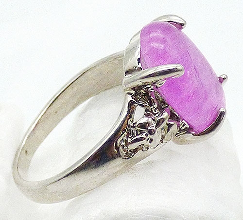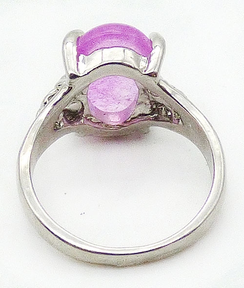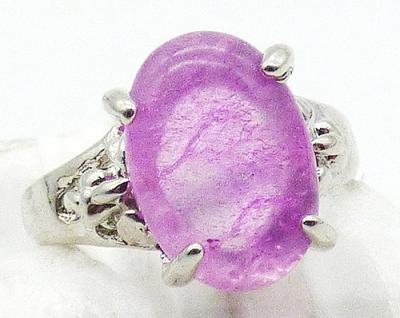 Description: Silver plated pink flawed art glass oval stone costume ring, a beautiful shade of pink, the flat stone is in a setting with a leafy design at the sides. Plain silver tone band.