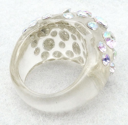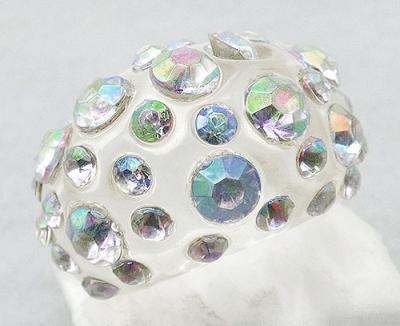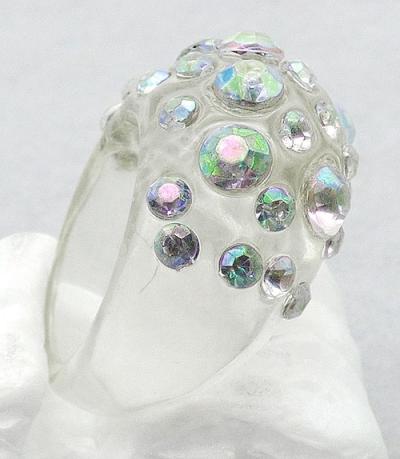 Description: Vintage clear lucite domed ring dotted with embedded larger and smalerl crystal aurora borealis rhinestones across the top. The stones are only across the top, the band tapers to about 1/4" wide at the bottom. Stones are all clear auroras, any color seen in the pictures is due to the defective coating.