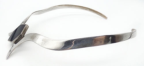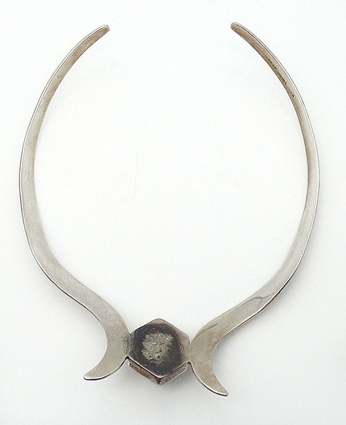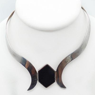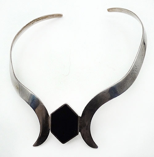 Description: Taxco Mexico sterling silver and onyx rigid collar necklace or neck ring; choker length with the centerpiece just at the hollow of the throat and open in back. The hexagonal centerpiece is between two curves of flat sterling and is set with a flat hexagonal black onyx stone. Signed '925', maker's mark, possibly TW-39 or TR-39, indicating Taxco maker and dating this piece to after 1980, and 'Mexico'.