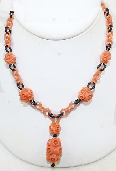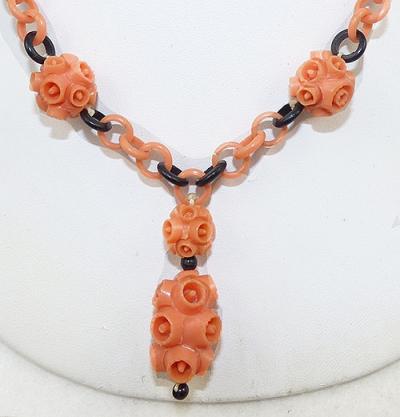 Description: Vintage celluloid bead and chain necklace; unique coral celluloid beads are molded in an unusual 3-dimensional suction cup design. Two beads, smaller and larger, hang in front as a drop, and two more are on each side, spaced across the coral and black celluloid chain. Silver tone spring ring clasp.