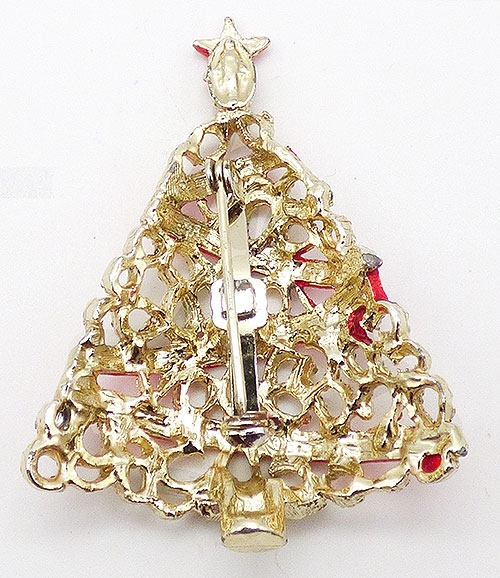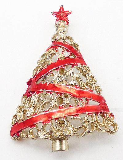 Description: Lacy gold tone Christmas tree brooch decorated with zig-zagging red enamel ribbon and a red enamel star on top.