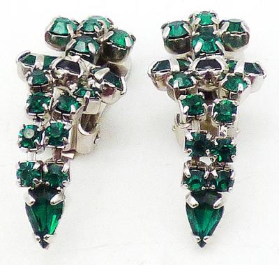 Description: Emerald green rhinestone drop clip earrings; Twi rows of emerald round rhinestone come to a point below a trio of emerald green teardrops and green rhinestone forming a cross at the top. Silver tone prong setting.