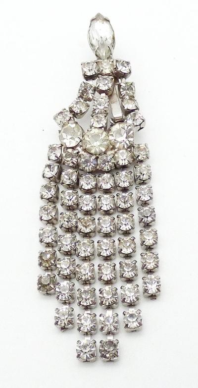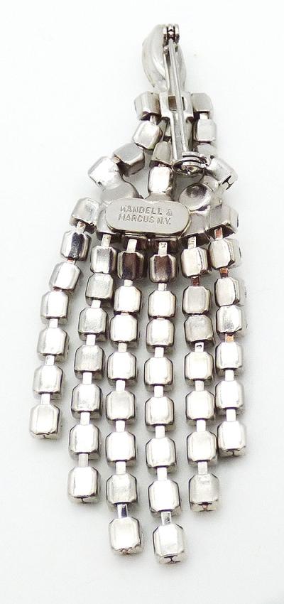 Description: Kendall & Marcus vintage silver tone clear rhinestone fringe brooch; a clear rhinestone navette at the top with three rhinestone rows that drop into a row of three fixed larger clear round rhinestones with long fringe made from six lengths of clear rhinestone chain. All stones prong set. Signed 'Kendall & Marcus NY' on a plaque on the back.