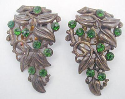 Description: Not one, but two vintage matching dress clips from the scarcely seen maker B. Blumenthal & Co. Inc. Each clip has leaves on curling vines cascading from a thick branch at the top and green rhinestones (grapes) set amongst the leaves. These were gold plated at one time, you can see the residue on the back, but most of the gold has worn off the fronts leaving the pewter colored base metal showing through. The hint of gold wash still remaining gives these clips a bronze toned patina. Each signed 'B Blumenthal Co Inc' on a plaque on the back.