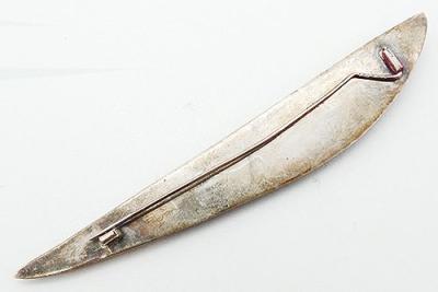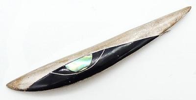 Description: Vintage signed modernist sterling, onyx and mother-of-pearl eye brooch; elongated eye inlaid with onyx beneath the heavy sterling eyelid. The pupil is inlaid mother-of-pearl with a thin sterling wire outline. Signed '925' 'ML' st the past of the pin stem.