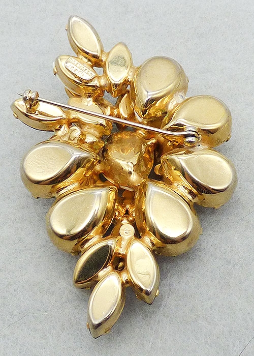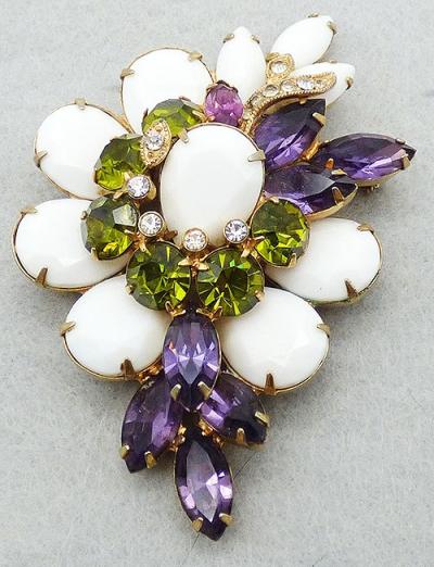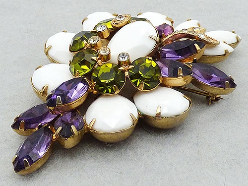 Description: Eisenberg Ice vintage white milk glass, amethyst and peridot rhinestones gold patted brooch; a layered design with a top layer of a large fat opaque while milk glass teardrop in the center ring ringed by small clear rhinestones and surrounded by a row of large peridot green round rhinestones. Sprays of amethyst rhinestone navettes are off to one side and at the bottom. The lower layer is a border of the fat white teardrops with a trio of white navettes art the top overlapped with a stem of clear rhinestone leaves. Signed 'Eisenberg Ice©' on the back.