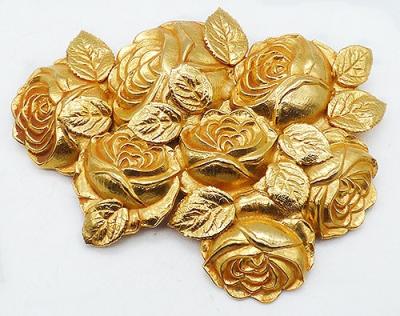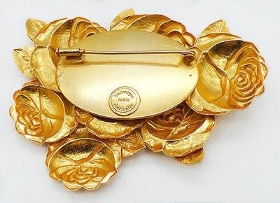 Description: Dominique Aurientis Paris golden metal roses brooch; a huge 1980's 3-dimensional statement brooch that's big enough to go with huge padded shoulders. The design is a cluster of different sized stamped metal roses, all large, with smaller leaves spread throughout. Trombone clasp and signed 'Dominique Aurientis Paris' on the back.
