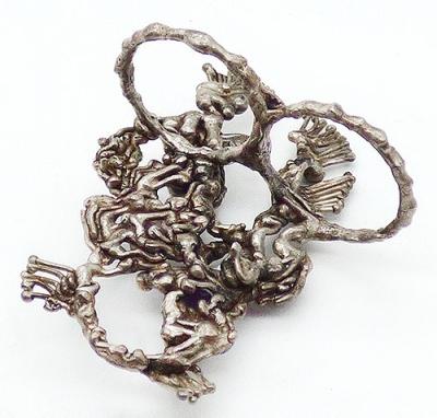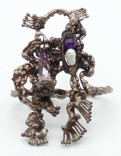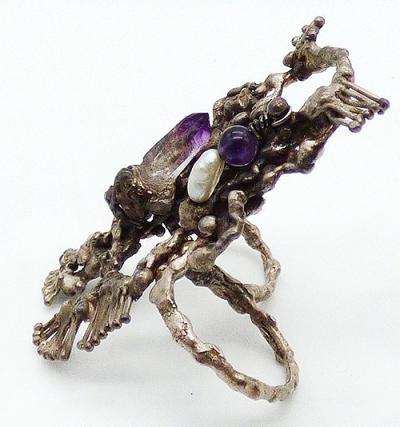 Description: Vintage sterling silver abstract Brutalist double finger ring, the unique design looks like the work of Carvalhu Rio de Janiero, but there are no legible marks. One side of the top has a 1/2" bi-color amethyst crystal point set and the other side has a freshwater pearl and amethyst bead wired into the design. Genuine amethyst and natural pearl, tests positive for sterling.