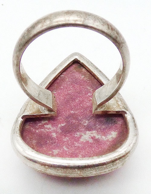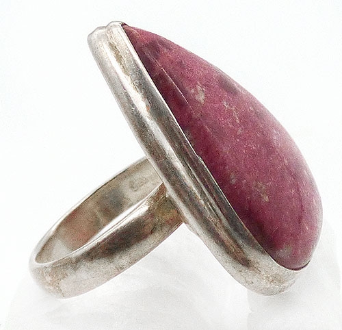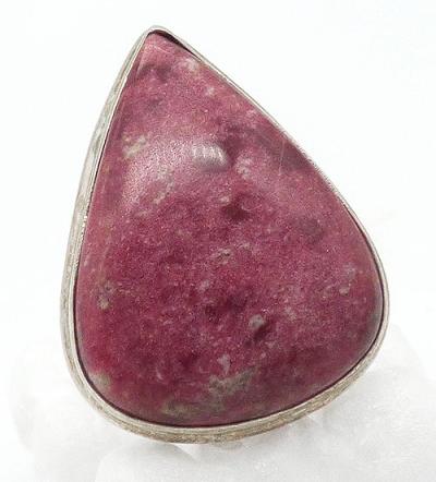 Description: Sterling silver and pink rhodonite ;ladies ring; a large, fat teardrop rhodonite stone is set into a grooved bezel setting. Hallmarked '925' on the inside of the band.