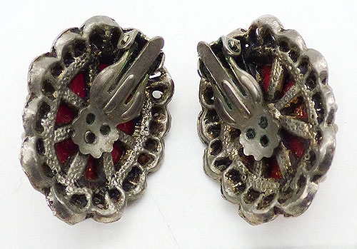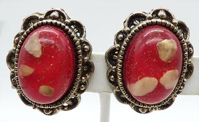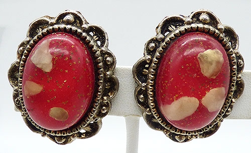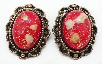 Description: Red confetti lucite oval cabochon vintage clip earrings; the huge lucite ovals have a bold red background with gold glitter and pieces of shell and are set into heavy silver tone scallop and bead edge frames. Possibly Selro or Selini.