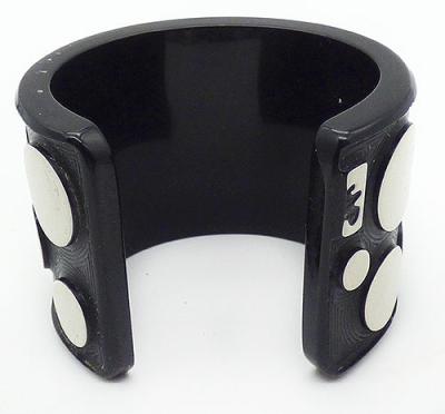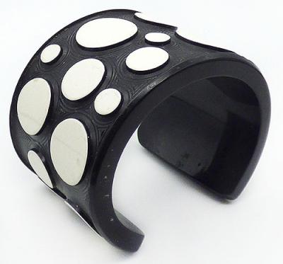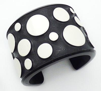 Description: Jean Marie Poinot French acrylic wide cuff bracelet; slightly raised off-white dot in three different sizes cover the black cuff etched with thin grooves following the outline of the dots. Marked 'JMP' on one end.