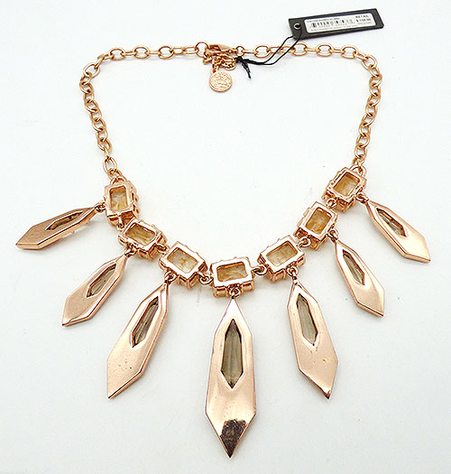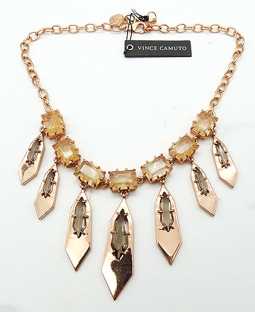 Description: Vince Camuto gold plated dangles and glass stone bib necklace; graduated size gold tone dangles are set with black diamond glass stones in their centers and hang from clear flawed glass rectangular stone links. Gold tone chain finishes the necklace on either side of the clear stones. A Camuto logo dangles from the end of the extender chain as does the original 'Vince Camuto paper hang tag.