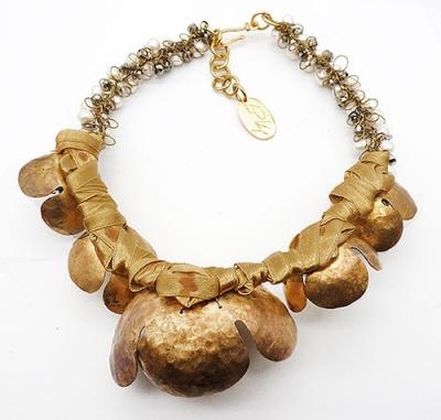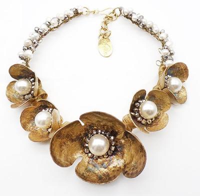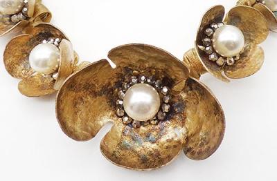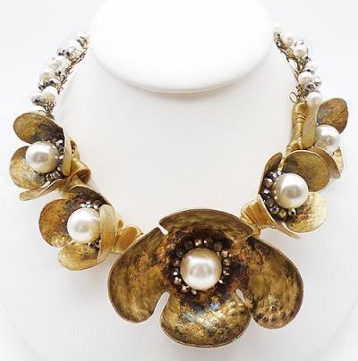 Description: Joe Vilaiwan golden flowers necklace; five huge 3-dimensional hammered gold tone flowers are wired onto a genuine fresh water pearl and silver arum crystal bead chain. The center flower is largest and each has a huge simulated pearl center surrounded by silver crystals. The wiring for the flowers is wrapped in golden ribbon. Gold tone extender chain signed with a 'Vilaiwan Fine Jewelry' hang tag, and wide hook closure.
