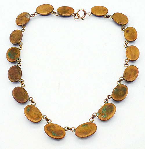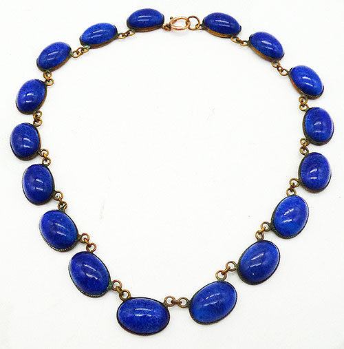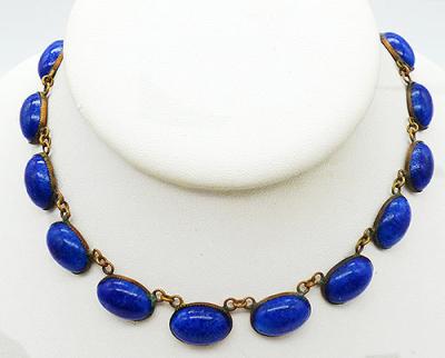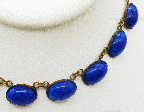 Description: Art Deco period blue lapis glass oval cabochon link necklace, each of the blue stones have a hint of sparkle mimicking lapis lazuli. The cabochons are mounted on oval beads links, seventeen in all.