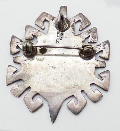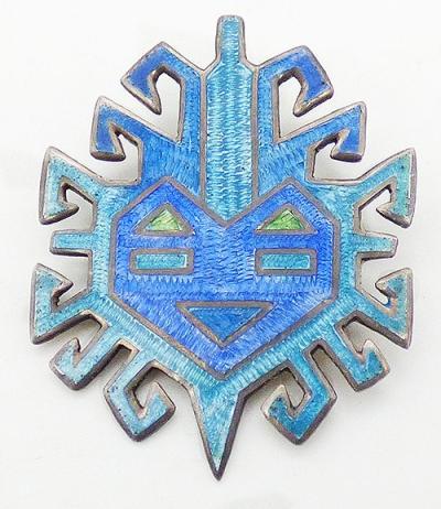Description: Mexican sterling silver basse-taille enamel Mayan mask brooch; a vibrant design with cobalt blue enamel face, light green enamel eyes and turquoise enamel headdress. Hook on the back for a chain. Signed only 'Mexico 925' on the back, similar to work by Jeronimo Fuentes.