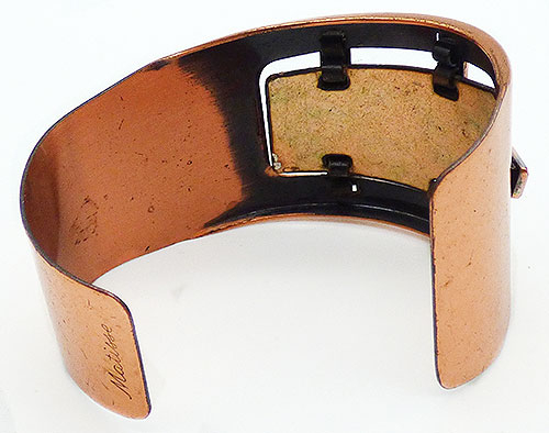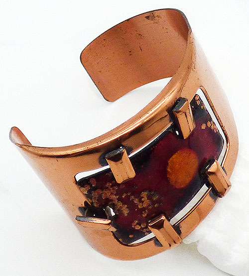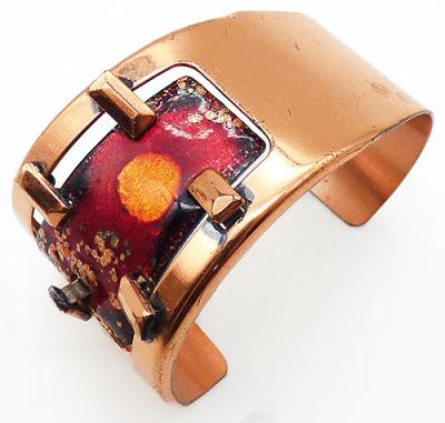 Description: Matisse vintage copper asymmetrical and tapered copper cuff bracelet; a trapezoidal panel is enameled in red with gold splatter and inset off-center into the wider side of the tapered copper band. Signed 'Matisse' (Renoir) on the edge of the narrower side of the band.