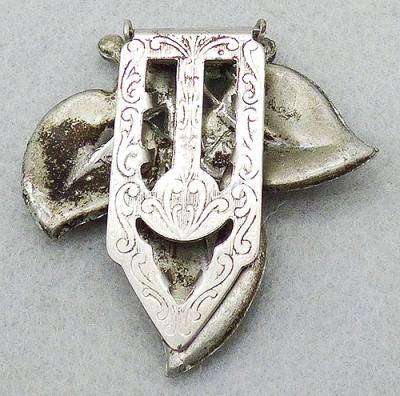 Description: Little Nemo vintage Art Deco pot metal clear rhinestone triple leaves dress clip; three cascading leaves on stems pavé set with clear rhinestones. Signed 'L/N' on the back.