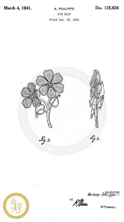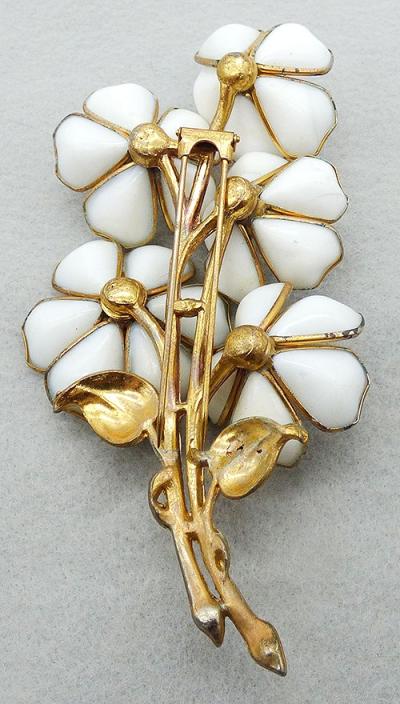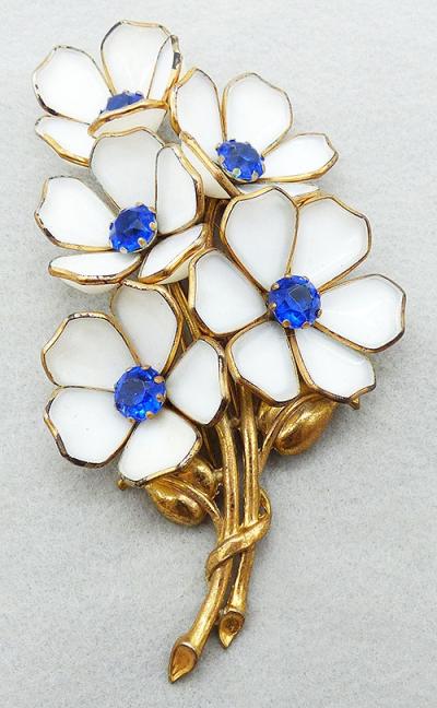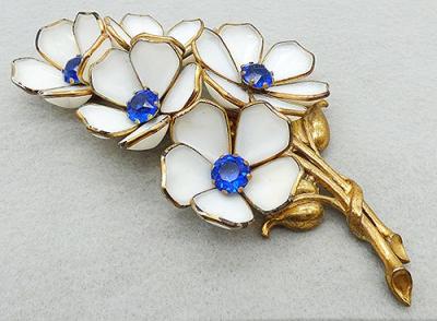 Description: Trifari enormous vintage white molded glass flowers fur clip; patented in 1941 by Alfred Phillipe, Des Patent 125626. This is the largest of these types of flower fur clips with five huge flowers, each with bezel set white molded glass petals and big sapphire blue rhinestone centers. The bouquet is on two thick gold plated stems with a pair of gold leaves. Confirmed Trifari design, see Patent last picture