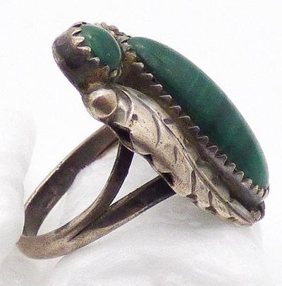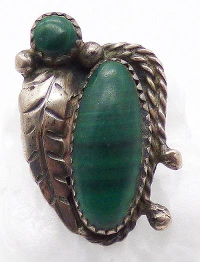 Description: Vintage Native American Navajo artist J. Roybal sterling silver ring; a large long oval malachite stone set inside a silver twisted rope frame with a sterling leaf along one side and a small round malachite set at the base of the leaf. Signed 'J Roybal' on the underside, tests positive for sterling.