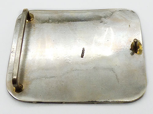 Description: Mexican vintage silver oversized belt buckle; a very large rectangle inlaid with two strips of wood alternating with three strips of abalone shell. Prong and bar on the back to attach to a wide belt. Signed 'Mexico' on the back.