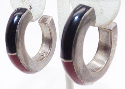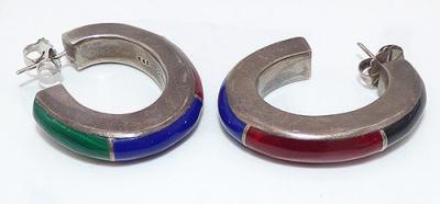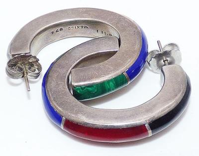 Description: Vintage Mexican sterling silver large hoop pierced post earrings; the thick silver hoops are inlaid with four pieces of narrow curved stones - black onyx on top, then red carnelian, then blue lapis around the bottom and finally green malachite at the back, the sections separate by sterling wire. Signed 'Mexican', '925' and 'TB-111' in the insides.