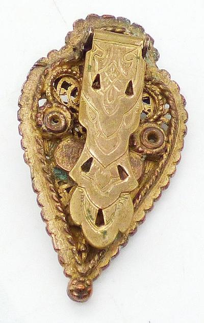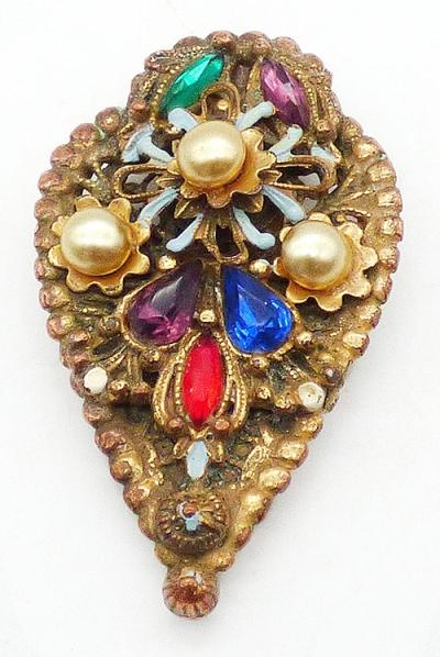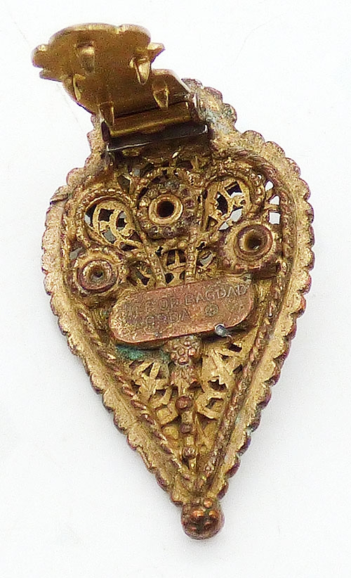 Description: Alexander Korda Thief of Bagdad dress clip; made by Rice Weiner to promote the 1940 movie of the same name. Gold plated with a trio of champagne faux pearl, rhinestone jewels and enameled metal. The rhinestones are emerald and amethyst navettes at the top, amethyst and sapphire teardrop and a ruby red navette in the center. Signed 'Thief of Bagdad Korda ©' on the back.