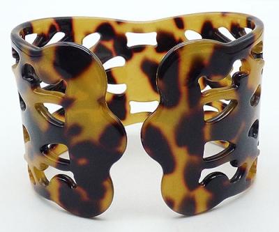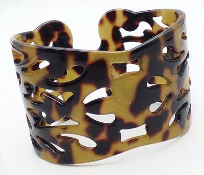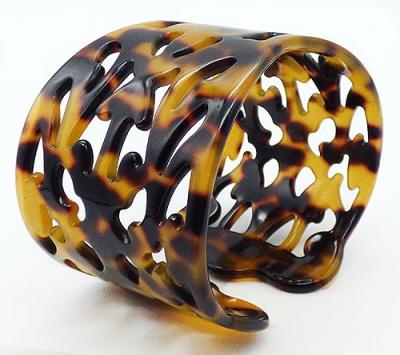 Description: Acrylic amber and black tortoise shell design wide cuff bracelet which tapers in the middle and widens out to the ends, which are wavy, not flat. The entire bracelet is covered with a cut-out pattern.