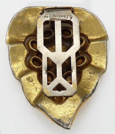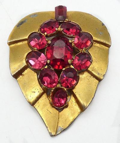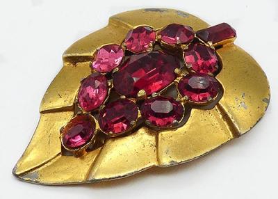 Description: Eisenberg Original enormous gold plated leaf dress clip; the center filled in with a huge ruby red oval rhinestone outlined with fuchsia pink oval rhinestones and with a large red rhinestone baguette as a stem at the top. Signed 'Eisenberg Original on the clip.