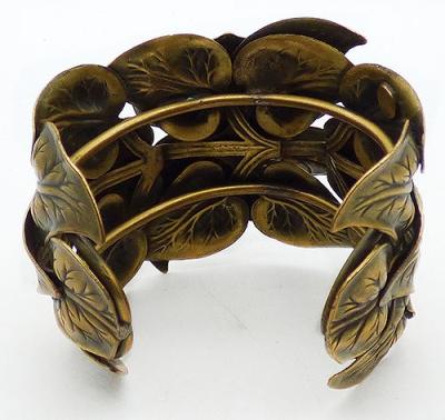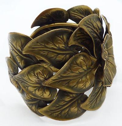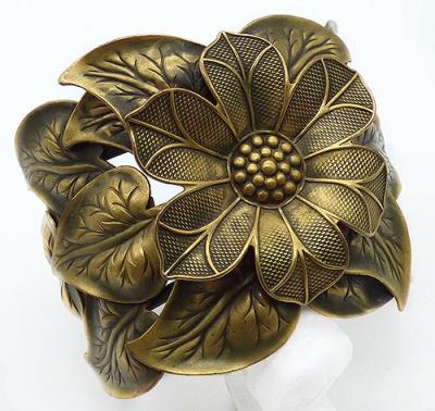 Description: Joseff of Hollywood gold tone oversized flower and leaves wide cuff bracelet; a huge textured sunflower in the center is surrounded by layers and layers of huge overlapping veined leaves that fan out, down and around the band. The flower and leaves are attached to a gold tone cuff frame to maintain the layering and dimension. Signed 'Joseff' on the back.