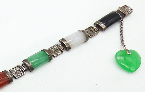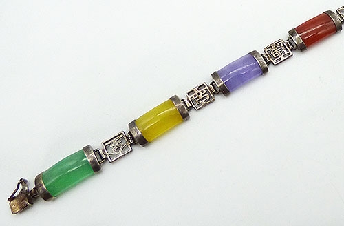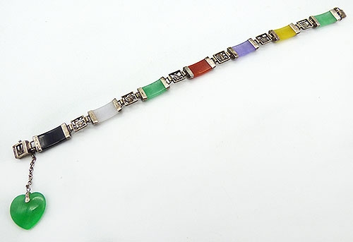 Description: Vintage sterling silver and jade link bracelet; each of the different colored jade stones test positive for nephrite jade except for the black, which is onyx. The rest of the stones are white green rust, lavender yellow and another green jade, all connected with sterling Chinese character links. The dangling heart charm tests positive apple green Jadeite. Hallmarked '925' on the back of the clasp.