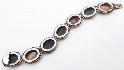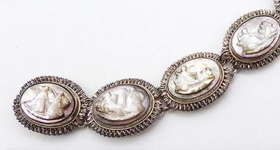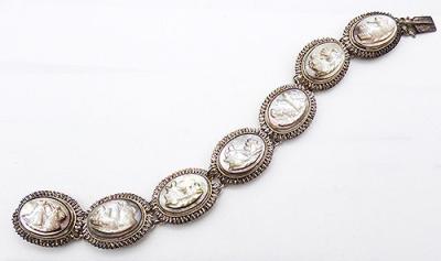 Description: Vintage Guiseppi Mandile 800 silver link bracelet set with seven mother-of-pearl mythical cameos. Each carving represents a day of the week and features seven intricately hand-carved mother-of-pearl cameos depicting a chariot driven by gods and goddesses including Zeus, Mars and Aphrodite. The cameo settings are famed by glittering silver wire decoration. Hallmarked '800' on the clasp and comes in its original burgundy presentation box (not shown) which is marked 'G. Mandrile Piazza S. Martina 8-10 Naples' in the inside of the lid.