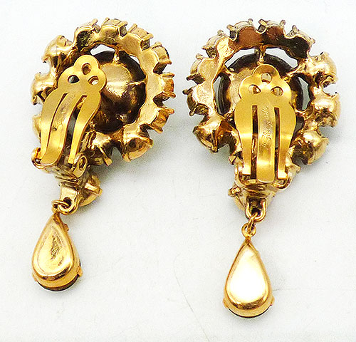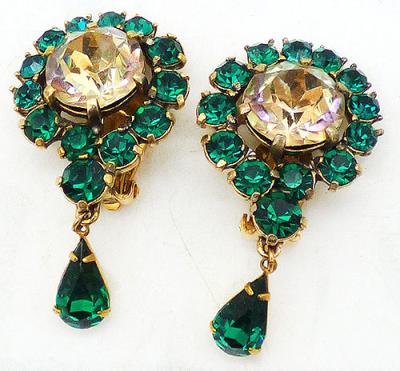 Description: Schiaparelli vintage gold plated emerald green and citrine yellow rhinestone clip earrings; a huge round pale yellow rhinestone center is surrounded by emerald green round rhinestones. An emerald teardrop rhinestone dangles from a slight larger green rhinestone at the bottom. Signed 'Schiaparelli' on the clips.