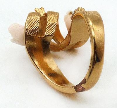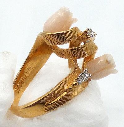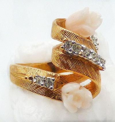 Description: Aurora Co. vintage 18KT HGE (heavy gold electroplate) spiral curl with carved coral roses ring; the wide textured gold plated band is curled into a coil with clear rhinestone set in a row along the top. The center curl is flanked by pale pink carved angel skin coral roses. Signed 'A' in a circle (mark for Aurora Co. ) and '18KT HGE' on there inside of the band.