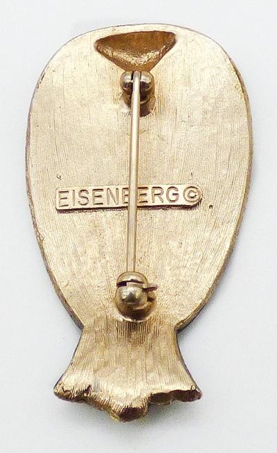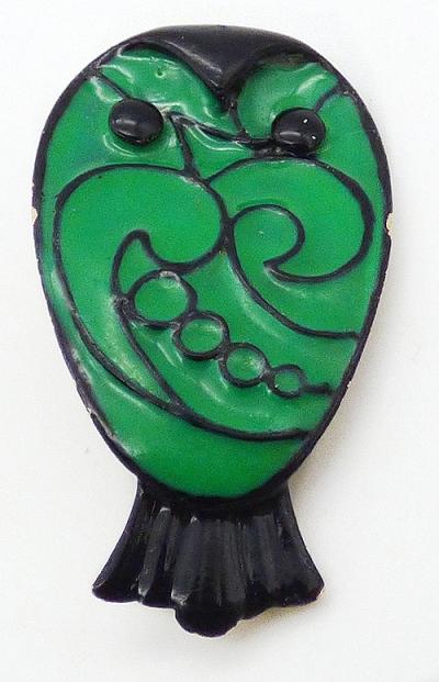 Description: Eisenberg vintage enamel gold plated owl brooch; part of the 1970's Picasso line of enamels. The owl is enameled in vibrant green with thin black circles and curls, a black tail , black eyes and a black crown. Signed block 'Eisenberg©' on the back.
