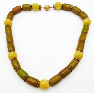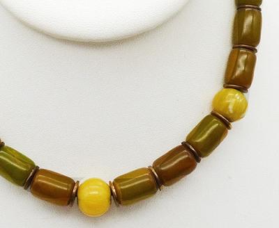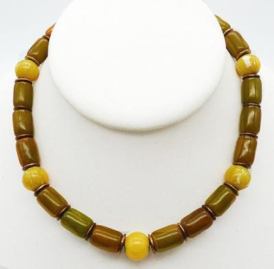 Description: Loius Rousselet 1930's galalith beads necklace; a single strand of marbled toffee and olive green barrel beads spaced every third bead with round golden yellow lightly marbled galalith beads. Some beads are more of the toffee, some more of the green. Strung on chain with round gold tone step barrel clasp. Attributed Louis Rousselet France.