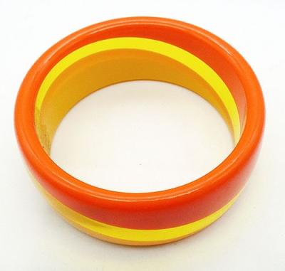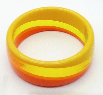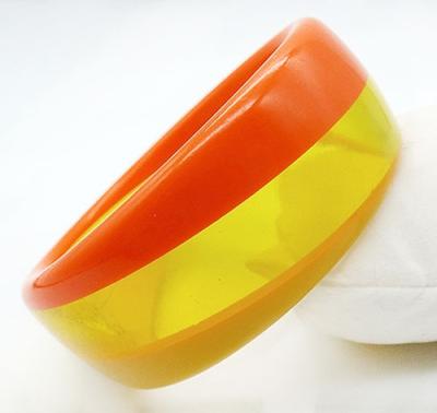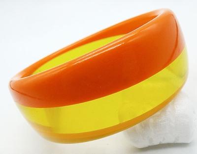 Description: Vintage 1960's laminated striped lucite bangle bracelet; the stripes are on a diagonal with transparent yellow in the middle and opaque yellow on one side, opaque orange on the other.