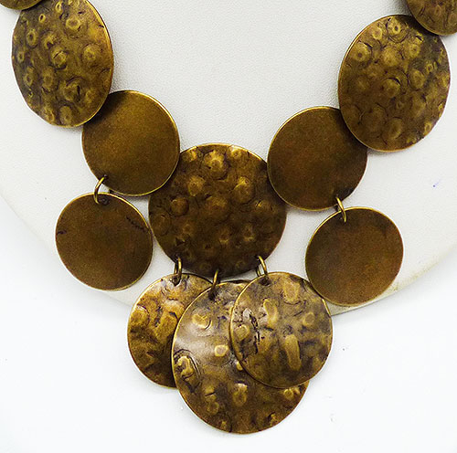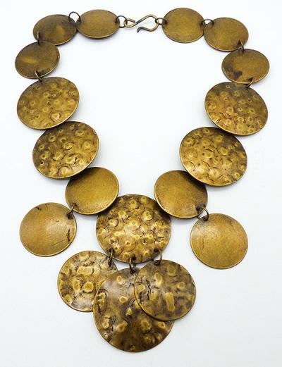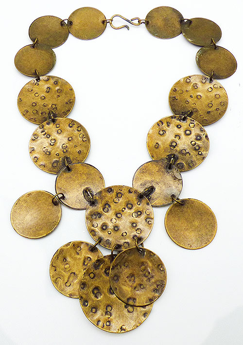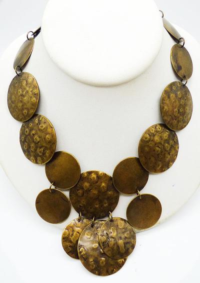 Description: Vintage 1970's brass discs link oversized bib necklace; larger round dimpled brass links alternate with smaller flat round links. A trio of three dimpled discs hand from the middle link with [;pin links hang o either side. Large hook clasp.