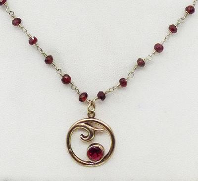 Description: Signed sterling sliver round pendant set with a genuine garnet stone hangs from a delicate garnet bead and sterling link chain finished with a length of silver chain and lobster clip. Signed '925' and possibly '©SAIK' though mark is not clear, on the back of the pendant.