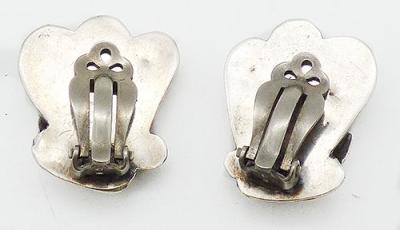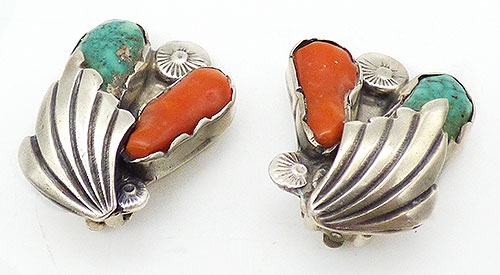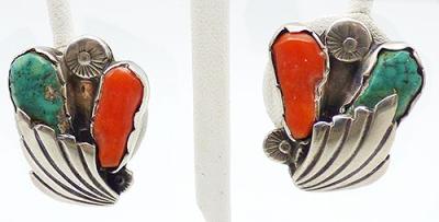 Description: Native American Navajo sterling silver turquoise and coral clip earrings; a large piece of coral and a large turquoise stone are bezel set with a big leaf overlapping the turquoise in front. One small dandelion style flower is between the stones and on is at the bottom next to the leaf. Tests positive for sterling.